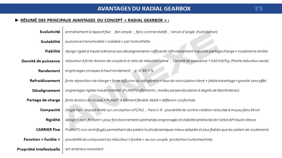Le Réducteur contrarotatif RADIAL GEARBOX représente assurément une alternative sérieuse pour la propulsion à très haute efficience, robuste et compacte, des moteurs aéronautiques commerciaux H2035+